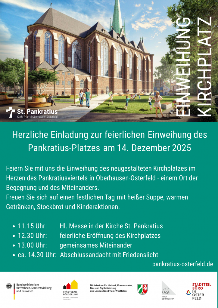 Das möchte die Gemeinde St. Pankratius gebührend feiern und lädt zu einer Einweihungsfeier ein: Am Sonntag, den 14. Dezember, findet um 11:15 die heilige Messe in der Kirche St. Pankratius statt. Im Anschluss sind alle Gemeindemitglieder, Anwohner*innen und Osterfelder*innen um 12:30 Uhr herzlich zur feierlichen Eröffnung mit heißer Suppe, warmen Getränken, Stockbrot und Kinderaktionen eingeladen.