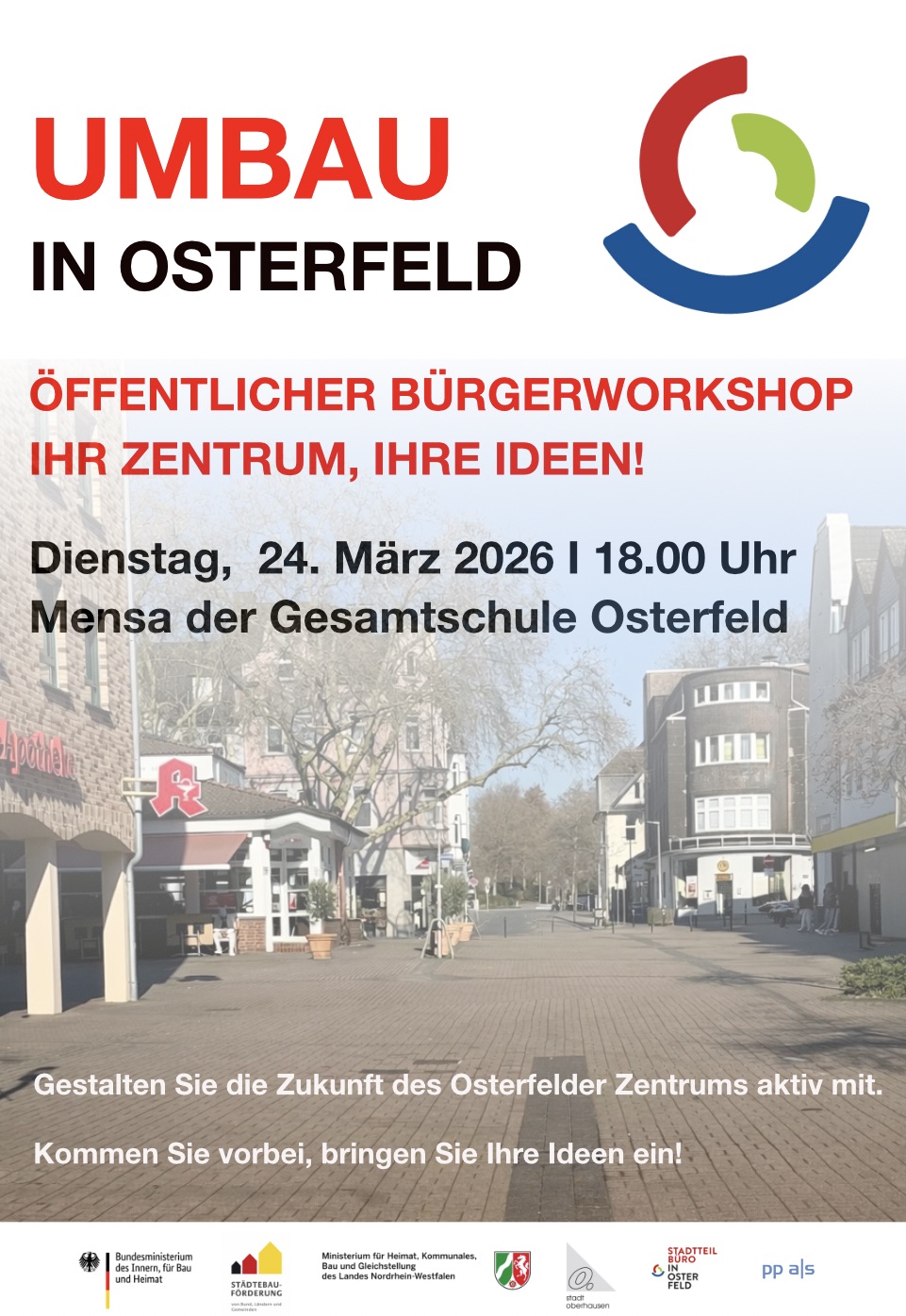 Wie viele Stadtteilzentren steht auch das Osterfelder Zentrum vor der Frage, wie es sich in Zukunft weiterentwickeln soll, damit es ein lebendiger und attraktiver Ort für alle bleibt und wird. Braucht es mehr Aufenthaltsqualität, mehr Grün, neue Nutzungen oder mehr Raum für Begegnung? Kommen Sie am 24.03. zur öffentlichen Bürgerveranstaltungen, informieren Sie sich über das Verfahren und bringen Sie ihre Anregungen und Ideen ein.