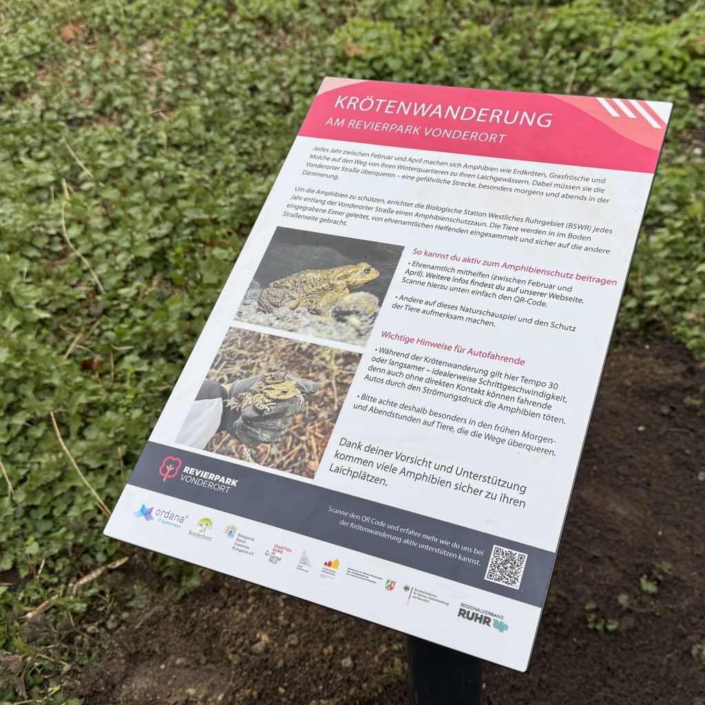 Im Revierpark Vonderort gibt es ab sofort neue Informationsschilder, die Besucher*innen über die heimischen Amphibienarten und ihre jährlichen Wanderungen informieren. Die Schilder wurden über den Verfügungsfonds gefördert und in enger Abstimmung mit dem Regionalverband Ruhr umgesetzt.